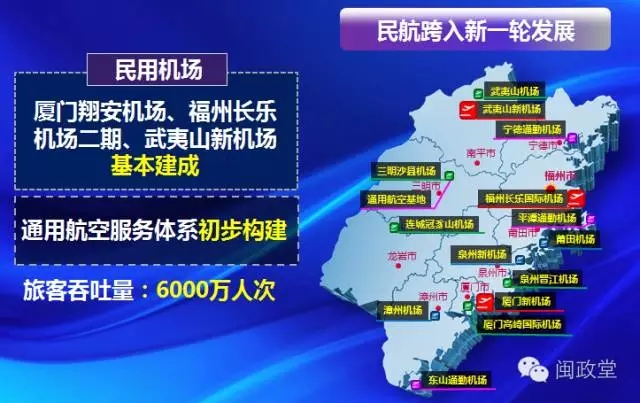 民航計(jì)劃完成投資800億,廈門(mén)翔安機(jī)場(chǎng)、福州長(zhǎng)樂(lè)機(jī)場(chǎng)二期、武夷山新機(jī)場(chǎng)基本建成,通用航空服務(wù)體系初步構(gòu)建。全省民航旅客吞吐量突破6000萬(wàn)人次。